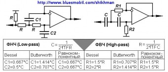 В промышленных конструкциях активных кроссоверов наибольшее распространение получили построенные на повторителях фильтры Баттерворта, Бесселя и Саллена-Ки. Как правило, используются фильтры второго порядка. Каждый из перечисленных типов имеет свои достоинства и недостатки. Фильтры Бесселя обладают самой гладкой фазовой характеристикой (как у одиночной RC-цепи), но суммарная АЧХ имеет провал величиной 3 дБ на частоте раздела. Фильтры Баттерворта обеспечивают плоскую суммарную АЧХ, но их фазовая характеристика более крутая. Наконец, фильтры Саллена-Ки (равнокомпонентные фильтры) очень удобны в серийном производстве, поскольку (как следует из названия) для них требуются детали одинаковых номиналов и с большим допустимым отклонением, чего нельзя сказать о фильтрах Баттерворта и Бесселя, требующих точных деталей. Однако фазовая и частотная характеристики равнокомпонентных фильтров самые худшие, поэтому их используют только в бюджетных моделях.