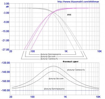 Любой фильтр (и активный, и пассивный) использует реактивные элементы - емкости и индуктивности, поэтому вносит в сигнал фазовые и временные искажения. Фильтры НЧ (Low Pass) вносят в сигнал запаздывание и отставание по фазе, которое можно в определенной мере скорректировать фазовращателем. При использовании фильтра Бесселя второго порядка в сочетании с таким фазовым корректором можно получить фильтр с абсолютно линейной фазовой характеристикой. Что же касается ФВЧ (High Pass), то они формируют фазовое опережение, которое принципиально невозможно состыковать с имеющимся ФНЧ.