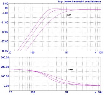 Получившийся "горб" на фазовой характеристике указывает на то, что разность фаз в области частоты раздела достаточно резко изменяется, соответственно может меняться и локализация кажущегося источника звука. Такая же картина будет наблюдаться при изменении частоты среза одного из фильтров, что иногда применяется при настройке суммарной АЧХ системы. Фаза излученного динамической головкой сигнала имеет мало общего с фазой поданного на нее напряжения (индивидуальна для каждого типа головки), но искажения такого рода в кроссовере желательно минимизировать.