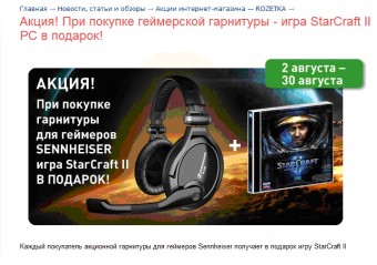 Акция продолжается до 30 августа, и в этот период любители и профессионалы кибер-спорта могут приобрести геймерские гарнитуры Sennheiser в интернет-магазине "Розетка" , и при этом получить специальный подарок - самую ожидаемую игру последних лет 'StarCraft -II '