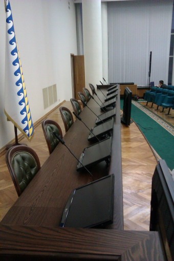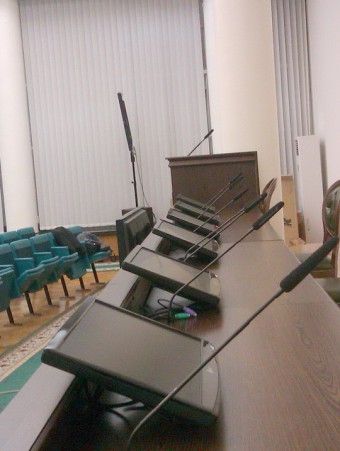 В далеком уже 2001 году наша компания уже инсталлировала этот зал. Но, время не стоит на месте. Появляются все более совершенные акустические системы, микрофоны и т.д... Условия для инсталляции были не новы: - "Акустика должна быть не видима, монтаж, в перерывах между заседаниями (после 19-00 и до конца), и все это не очень дорого".Кроме того, требовалось установить в президиуме восемь микрофонов и один на трибуне.Задача! Выставить девять микрофонов в очень гулком зале. Вывести их на нормальную громкость, учитывая тот факт, что большинство говорящих в президиуме, не умеют работать с микрофонами. И при всем при этом, звуковая система не должна "заводиться".Работа для самых "невидимых" и умных колонок в мире - K-ARRAY. Умных, потому что снабжены встроенными DSP-процессорами. Тем более, что есть готовые комплекты на разные мощности: KR102, KR202, KR402. Остановились на "младшеньком" - KR 102.При выборе микрофонов однозначно решили остановиться на конференционных капсулях SENNHEISER ME36 в сочетании с "гузнеками" SENNHEISER MZH3040 и настольными базами SENNHEISER MZTX31PTT. Все установили за один вечер. Включили. Слегка "порезали" свистящие частоты и все работает прекрасно.